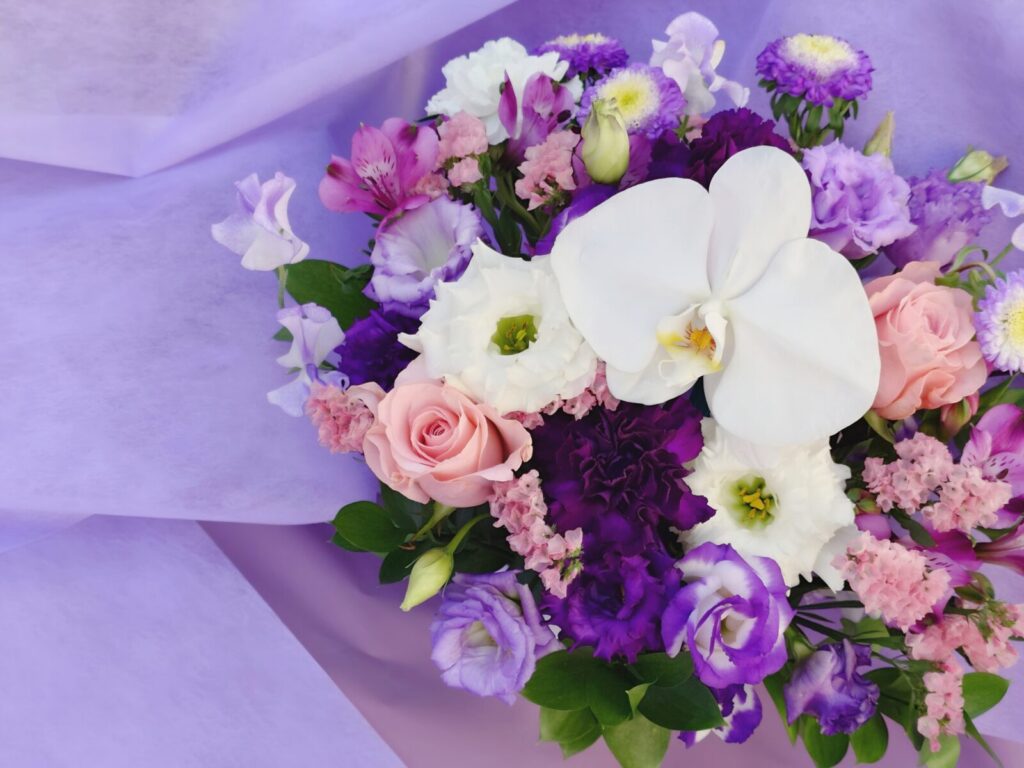 色の組み合わせ、花の形や表情、全体の雰囲気、そして花言葉。 ひとつひとつを見ながら、「この推しだったらどんな花が似合うだろう」と想像し、丁寧にお作りします。